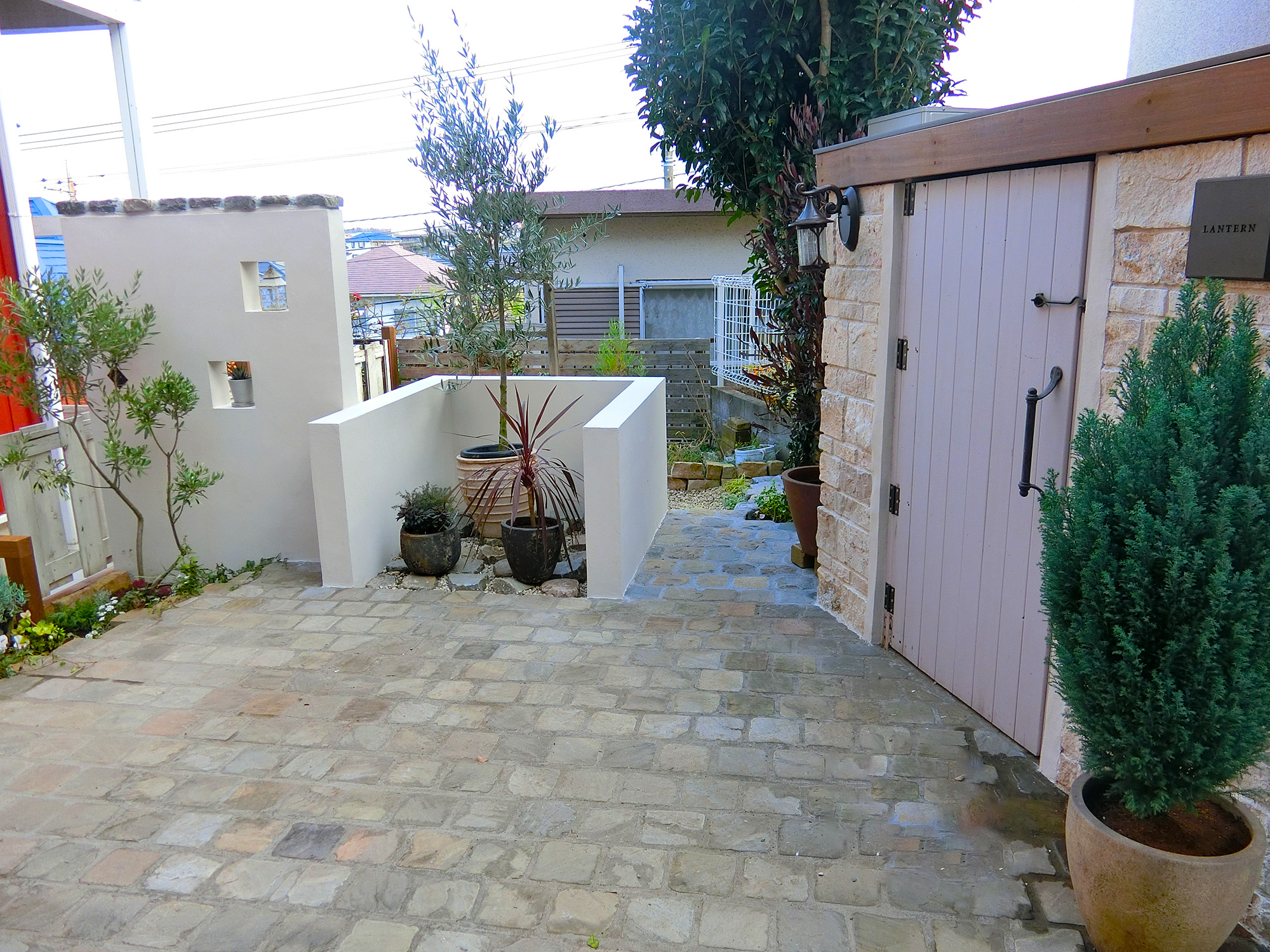 明るい塀と石畳の床、お気に入りの植物に囲まれたおしゃれなお庭「プライベート空間」へ