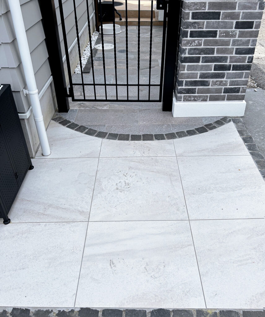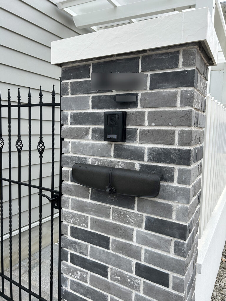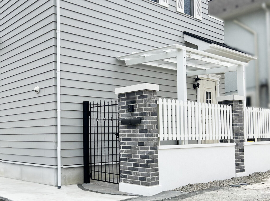グレーを基調としたブリックレンガが門柱になっています。こちらの門柱は、お客様がとてもこだわられていたポイント。レンガの色、目地の色まで、悩みに悩んで決められました。グレーもたくさんの種類のグレーがあります。暗すぎず、明るすぎないカラーがお家を引き立ててくれます✨