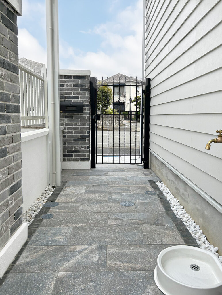 水色やグレーを基調としたヨーロピアンスタイルの外構
