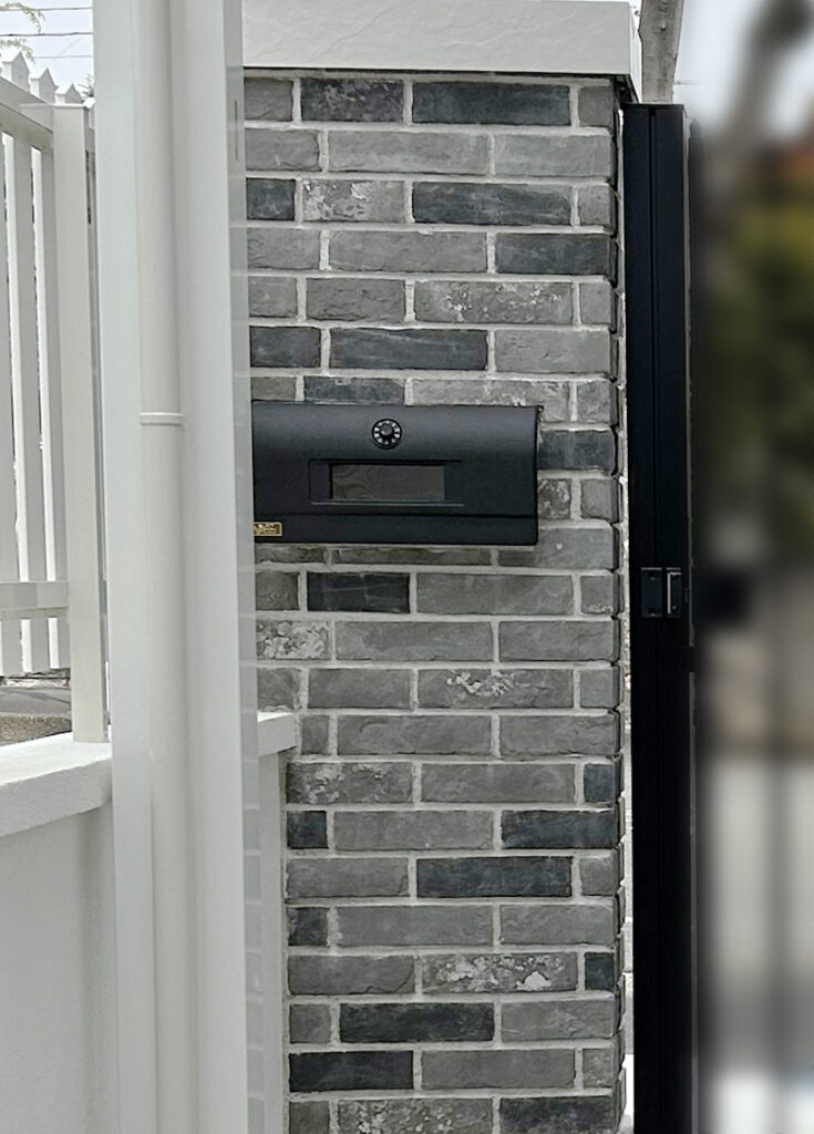 門柱に設置されているポストも珍しい形状でおしゃれなんです。こちらはディーンズガーデンさんのものです。表側もかわいいですが、裏側も色味があるのがポイント。ポストは表側は色があっても後ろは味気ないものが多いので、お客様は裏側も色味がある点を気に入られていました。